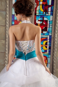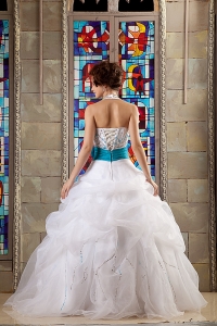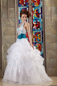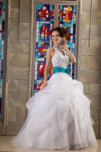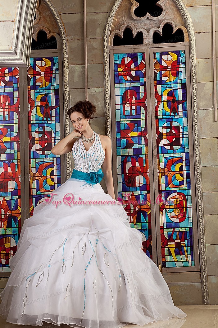 Beaded White Halter Organza Quinceanea Dress With Sash