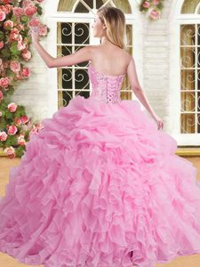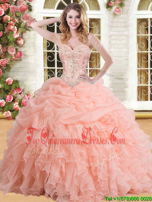 Beading and Appliques and Ruffles and Pick Ups Quinceanera Gowns Peach Lace Up Sleeveless Floor Length
