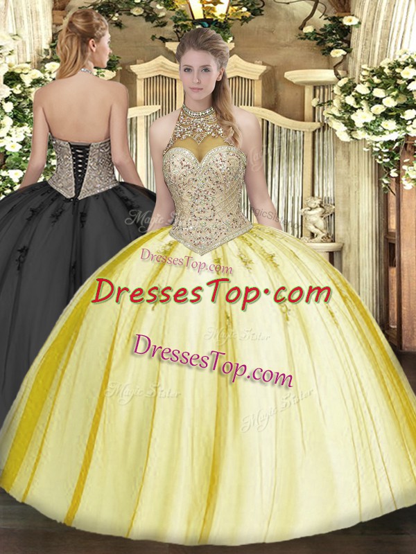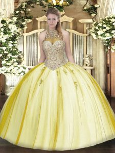 Beading and Appliques Quinceanera Dresses Yellow Lace Up Sleeveless Floor Length