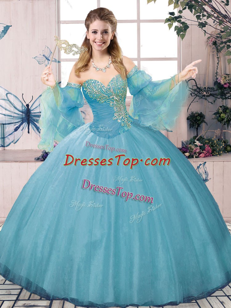 Beading and Ruching 15th Birthday Dress Blue Lace Up Long Sleeves