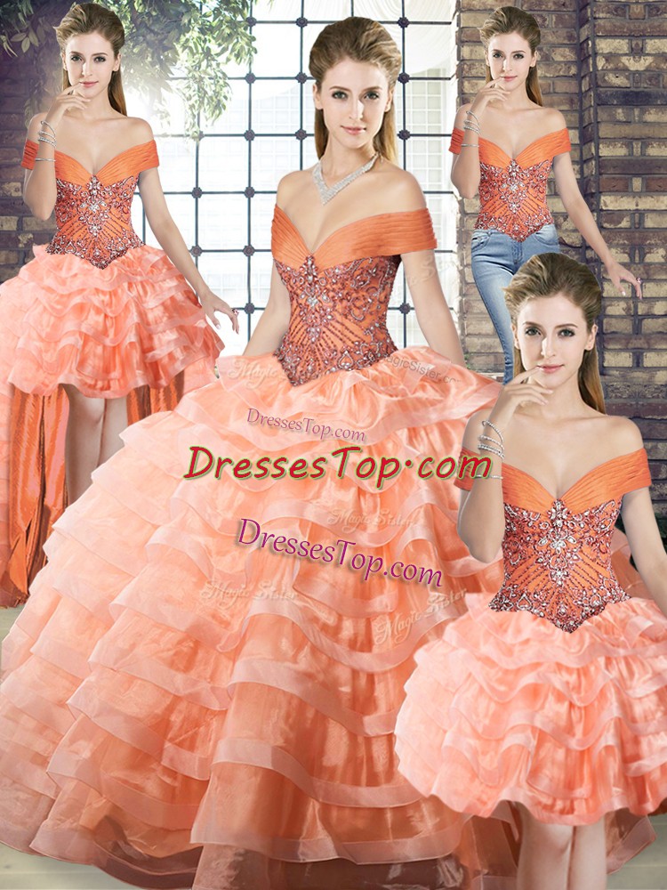 Beading and Ruffled Layers Quinceanera Dresses Peach Lace Up Sleeveless Brush Train