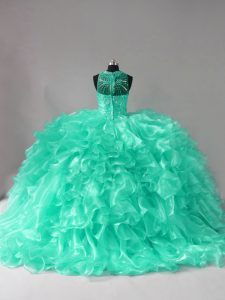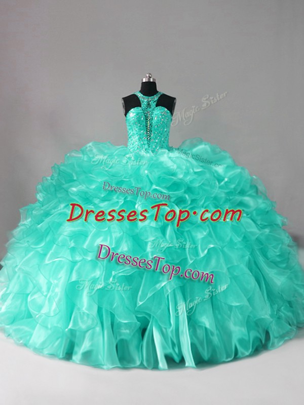 Beading and Ruffles 15 Quinceanera Dress Aqua Blue Zipper Sleeveless Brush Train