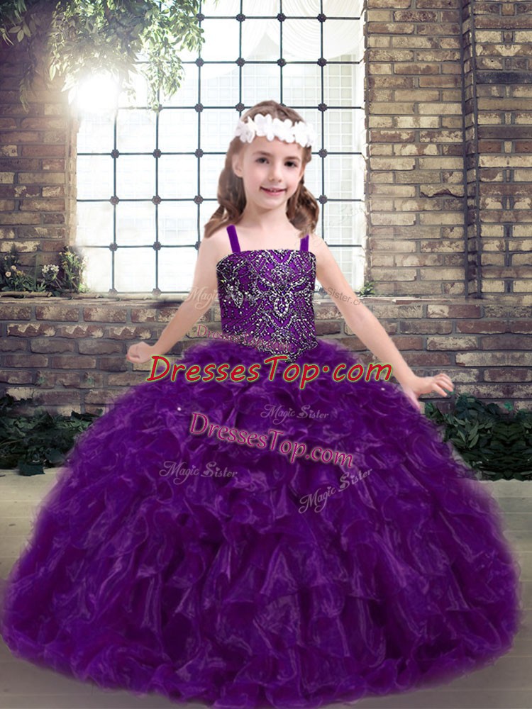Beading and Ruffles Little Girls Pageant Dress Eggplant Purple Lace Up Sleeveless Floor Length