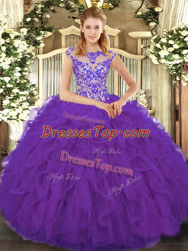 Beading and Ruffles Quinceanera Gowns Eggplant Purple Lace Up Cap Sleeves Floor Length
