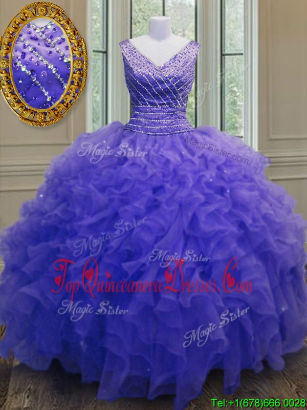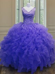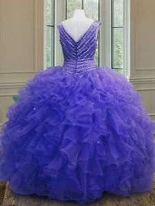 Beading and Ruffles Quinceanera Gowns Purple Zipper Sleeveless Floor Length