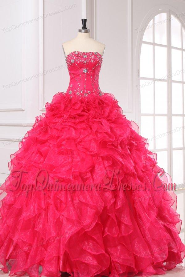 Beading and Ruffles Strapless Organza Quinceanera Dress in Coral Red