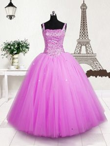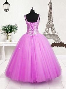 Beading and Sequins Pageant Dress Rose Pink Lace Up Sleeveless Floor Length