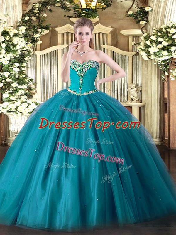 Beading Quinceanera Dresses Teal Lace Up Sleeveless Floor Length