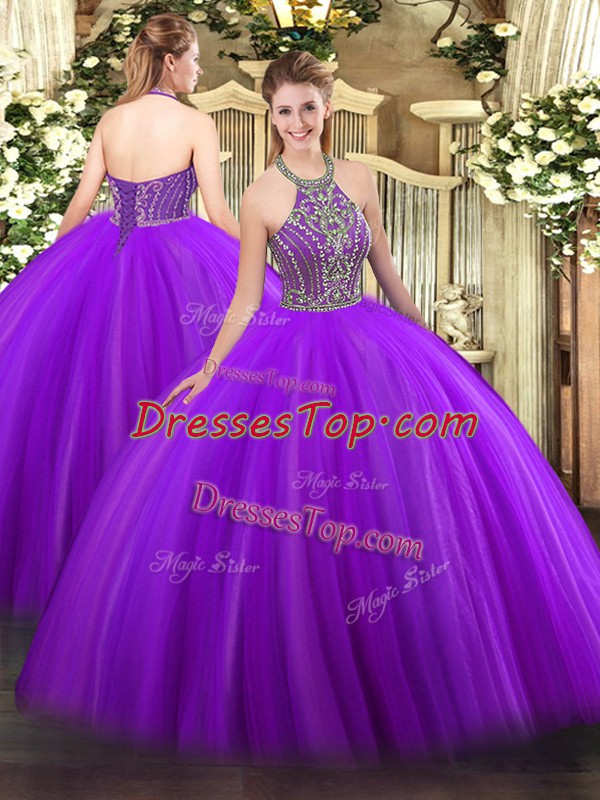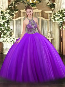 Beading Quinceanera Gowns Purple Lace Up Sleeveless Floor Length