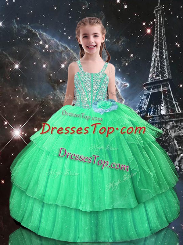 Beauteous Apple Green Sleeveless Beading and Ruffled Layers Floor Length Pageant Dress for Teens