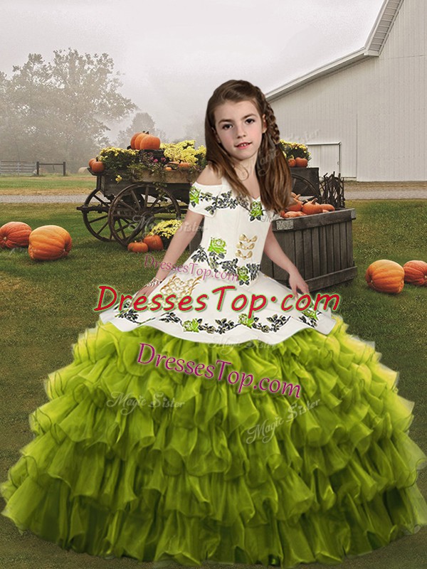 Beauteous Ball Gowns Kids Formal Wear Olive Green Straps Organza Sleeveless Floor Length Lace Up