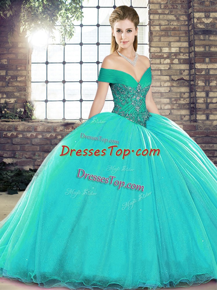 Beauteous Beading Sweet 16 Quinceanera Dress Turquoise Lace Up Sleeveless Brush Train