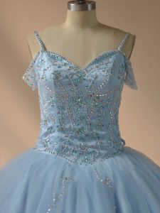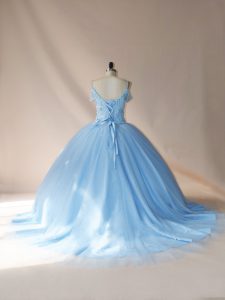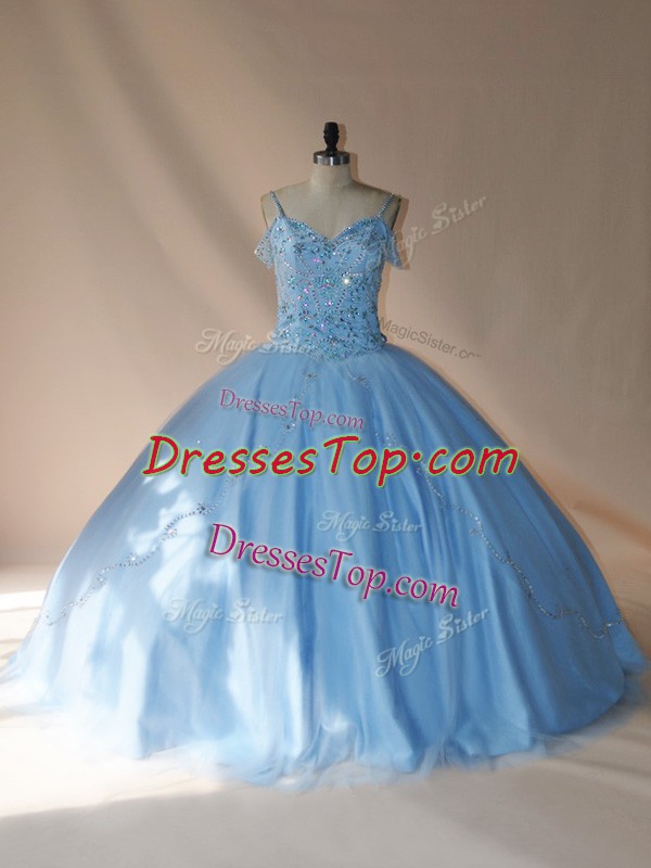 Beauteous Blue and Light Blue Sweet 16 Dresses Sweet 16 and Quinceanera with Beading V-neck Sleeveless Brush Train Lace Up