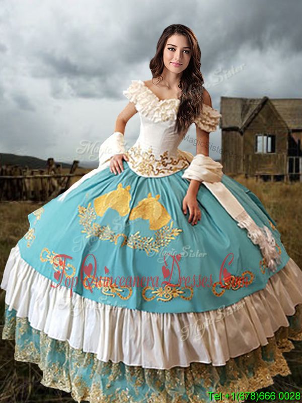 Beauteous Blue And White Sweet 16 Quinceanera Dress Military Ball and Sweet 16 and Quinceanera and For with Lace and Embroidery and Ruffled Layers Off The Shoulder Short Sleeves Lace Up