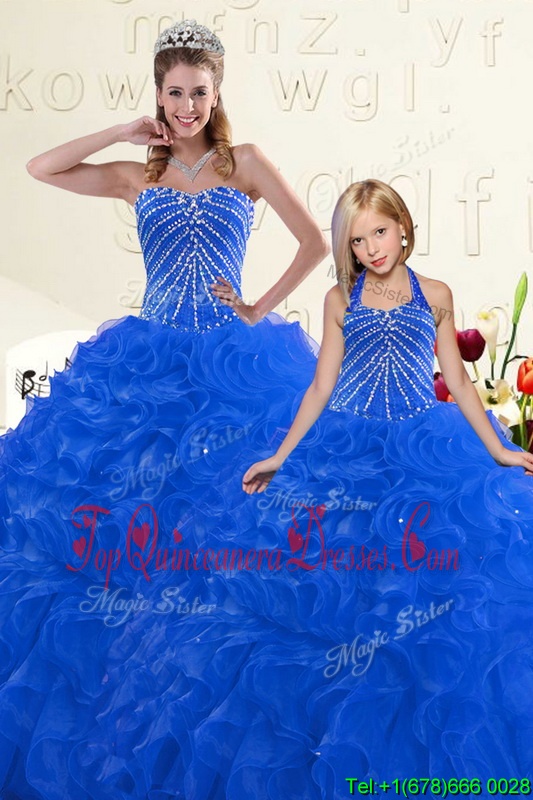 Beauteous Floor Length Blue Quinceanera Gowns Organza Sleeveless Beading and Ruffles