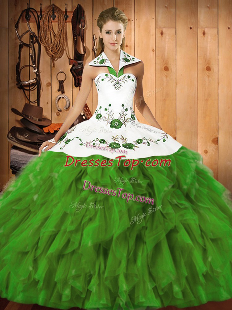 Beauteous Floor Length Olive Green Sweet 16 Dress Halter Top Sleeveless Lace Up