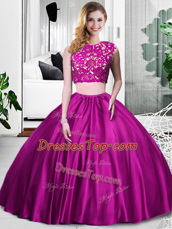 Beauteous Fuchsia Two Pieces Scoop Sleeveless Taffeta Floor Length Zipper Lace and Ruching 15 Quinceanera Dress