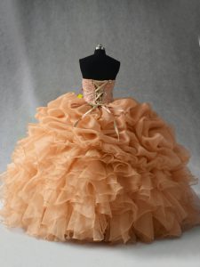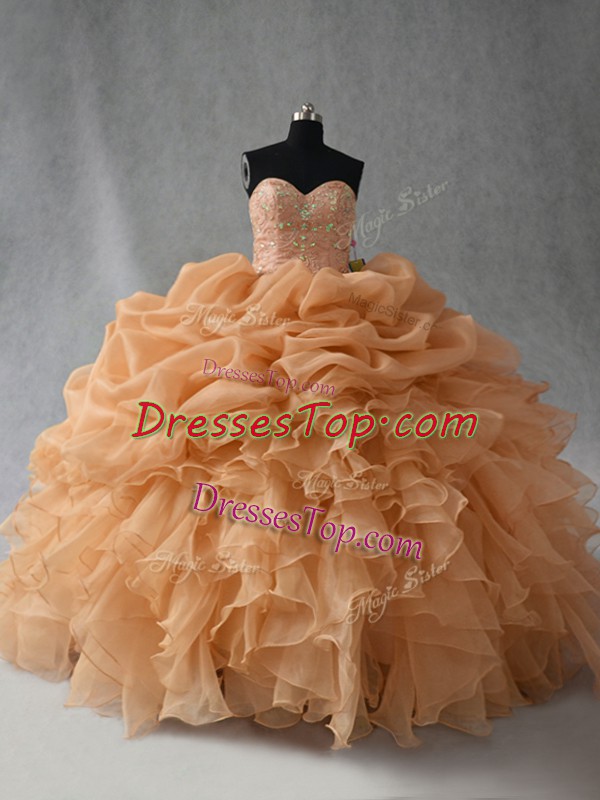 Beauteous Gold Ball Gowns Organza Sweetheart Sleeveless Beading and Ruffles and Pick Ups Floor Length Lace Up 15th Birthday Dress