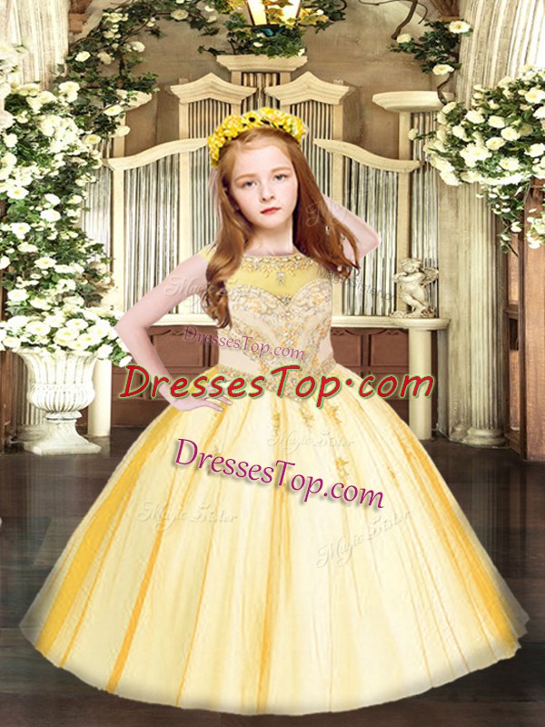 Beauteous Gold Sleeveless Floor Length Beading and Appliques Zipper Pageant Gowns For Girls