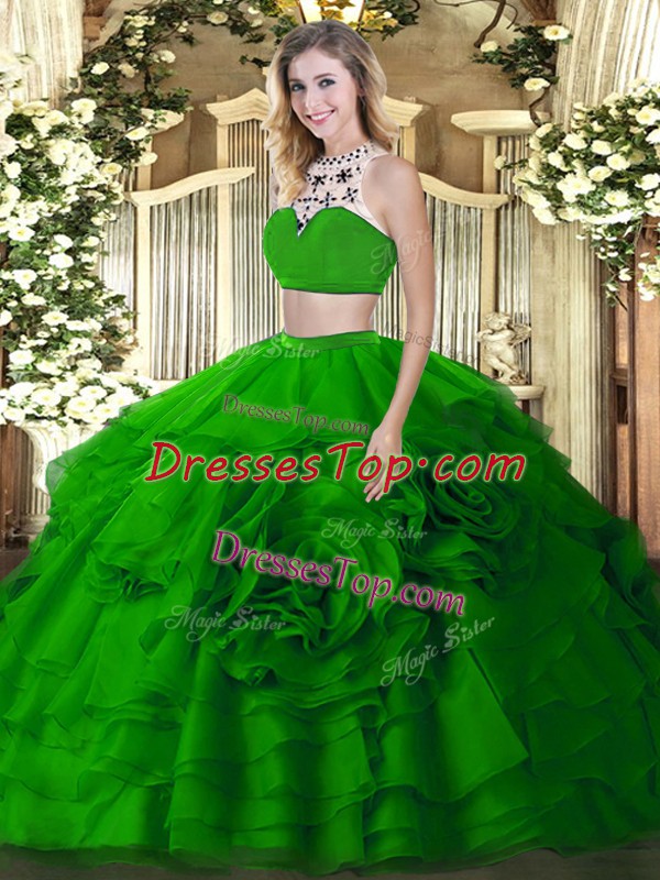 Beauteous Green High-neck Neckline Beading and Ruffled Layers Quince Ball Gowns Sleeveless Backless