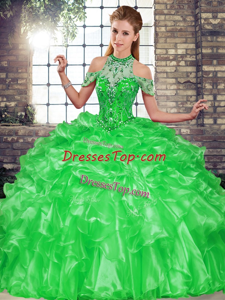 Beauteous Halter Top Sleeveless Lace Up Quinceanera Gowns Green Organza