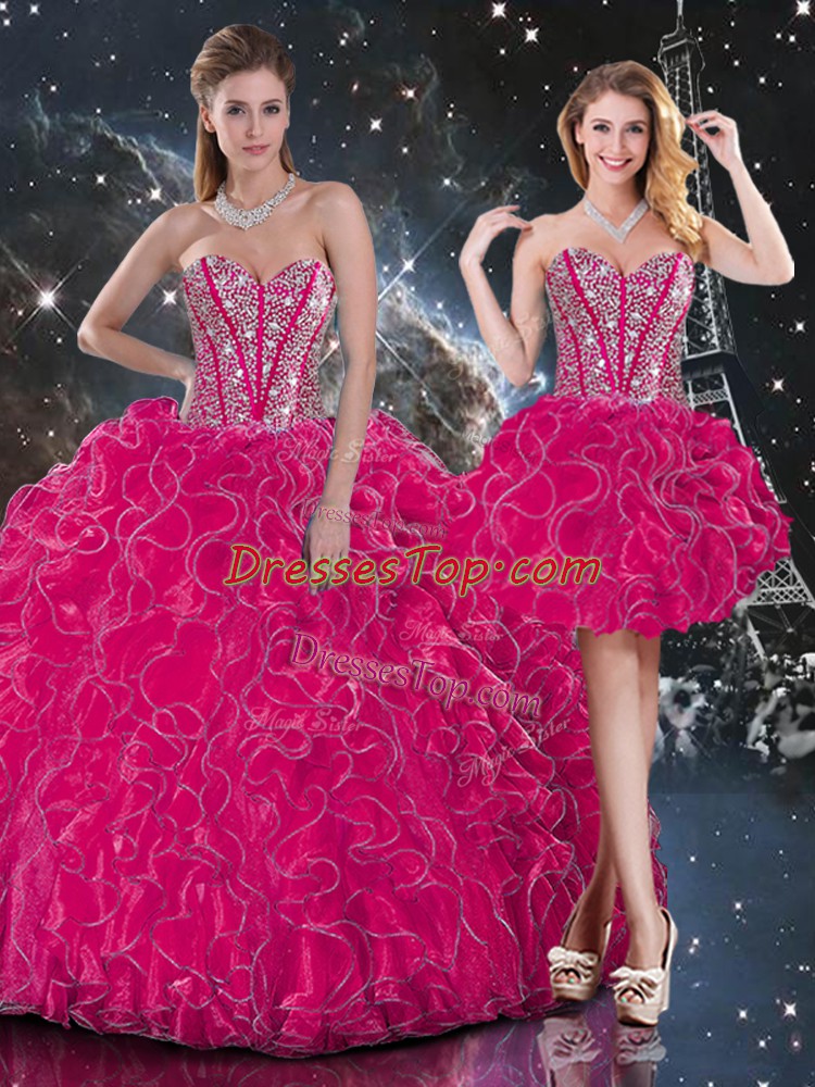 Beauteous Hot Pink Organza Lace Up Vestidos de Quinceanera Sleeveless Floor Length Beading and Ruffles