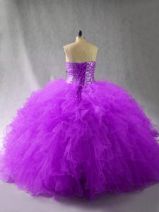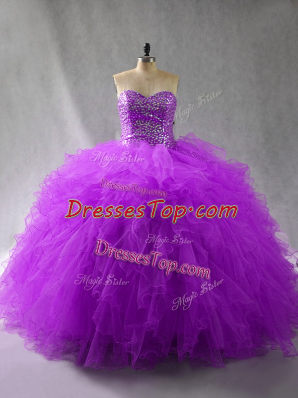 Beauteous Purple Ball Gowns Tulle Sweetheart Sleeveless Beading and Ruffles Floor Length Lace Up Sweet 16 Quinceanera Dress