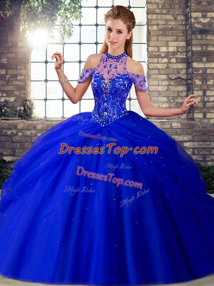 Beauteous Royal Blue Tulle Lace Up Halter Top Sleeveless Ball Gown Prom Dress Brush Train Beading and Pick Ups