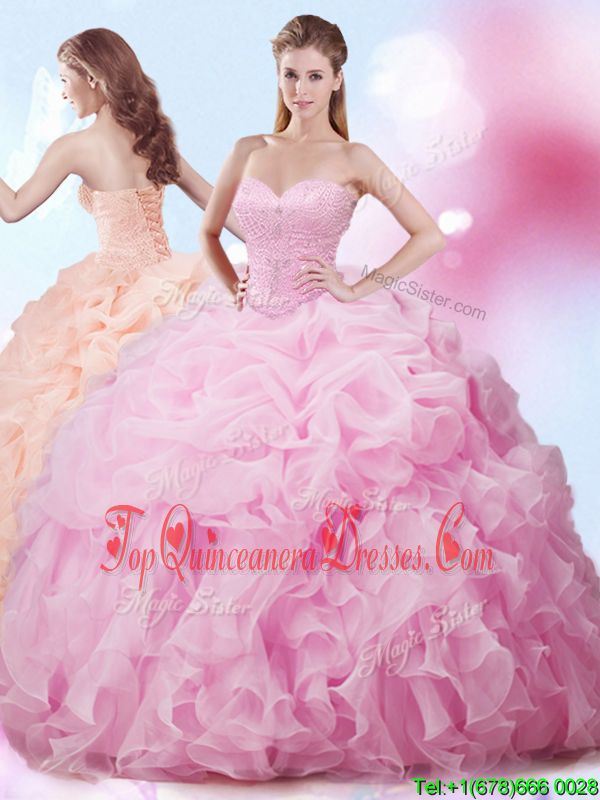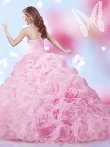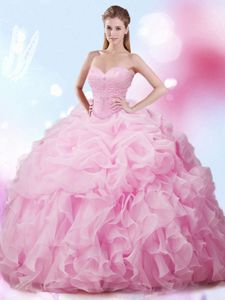 Beauteous Sleeveless Organza With Brush Train Lace Up Sweet 16 Dress in Rose Pink for with Beading and Ruffles and Pick Ups