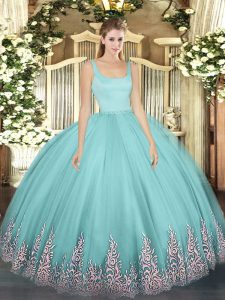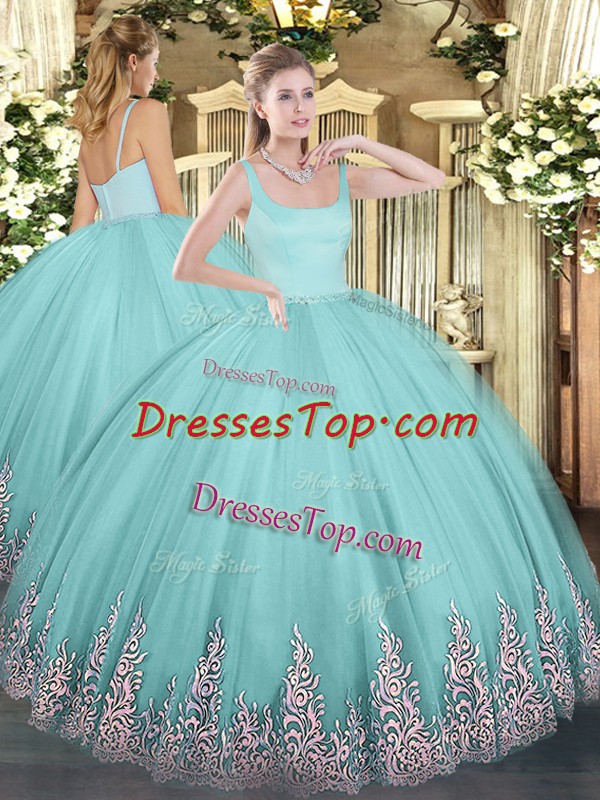 Beauteous Straps Sleeveless Sweet 16 Dress Floor Length Appliques Aqua Blue Tulle