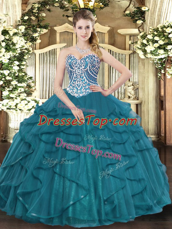 Beauteous Sweetheart Sleeveless Quinceanera Gowns Floor Length Beading and Ruffles Teal Tulle