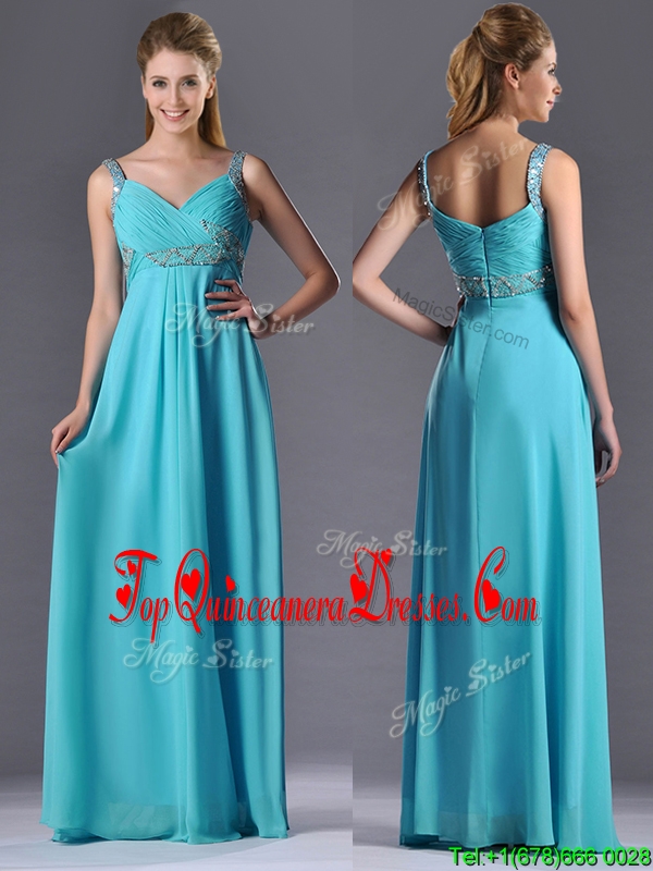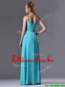 Beautiful Empire Aqua Blue Long Dama Dress with Beading and Ruching