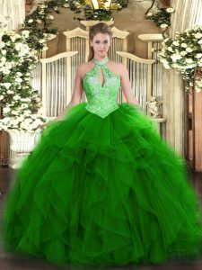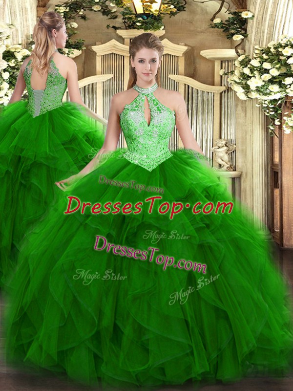 Beautiful Green Lace Up Halter Top Ruffles and Sequins Quinceanera Dress Organza Sleeveless