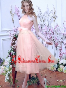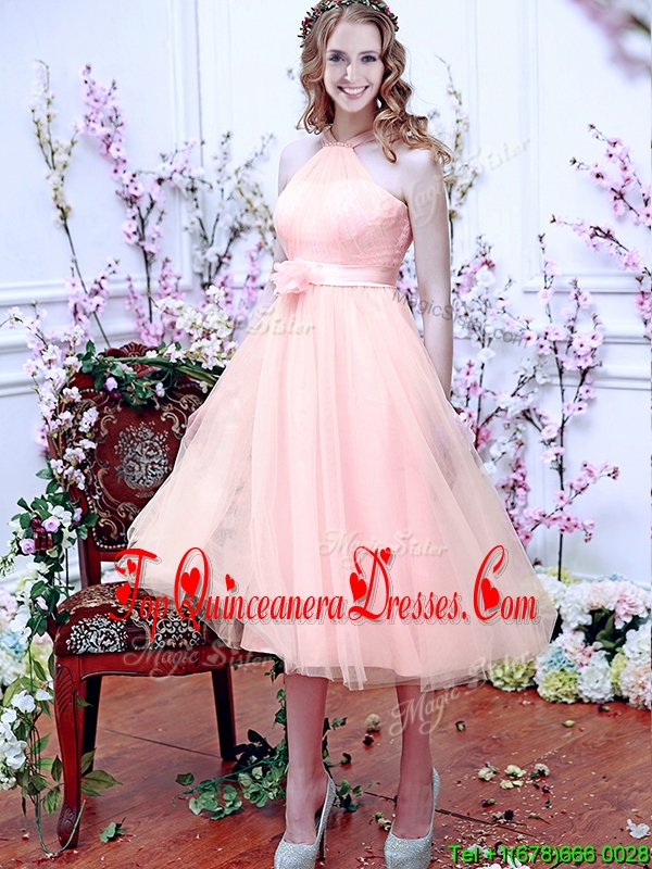 Beautiful Halter Top Baby Pink Quinceanera Dama Dress with Hand Made Flowers