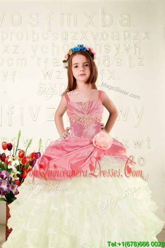 Beautiful Pink Ball Gowns Organza Straps Sleeveless Beading and Ruffled Layers and Hand Made Flower Floor Length Lace Up Pageant Dress