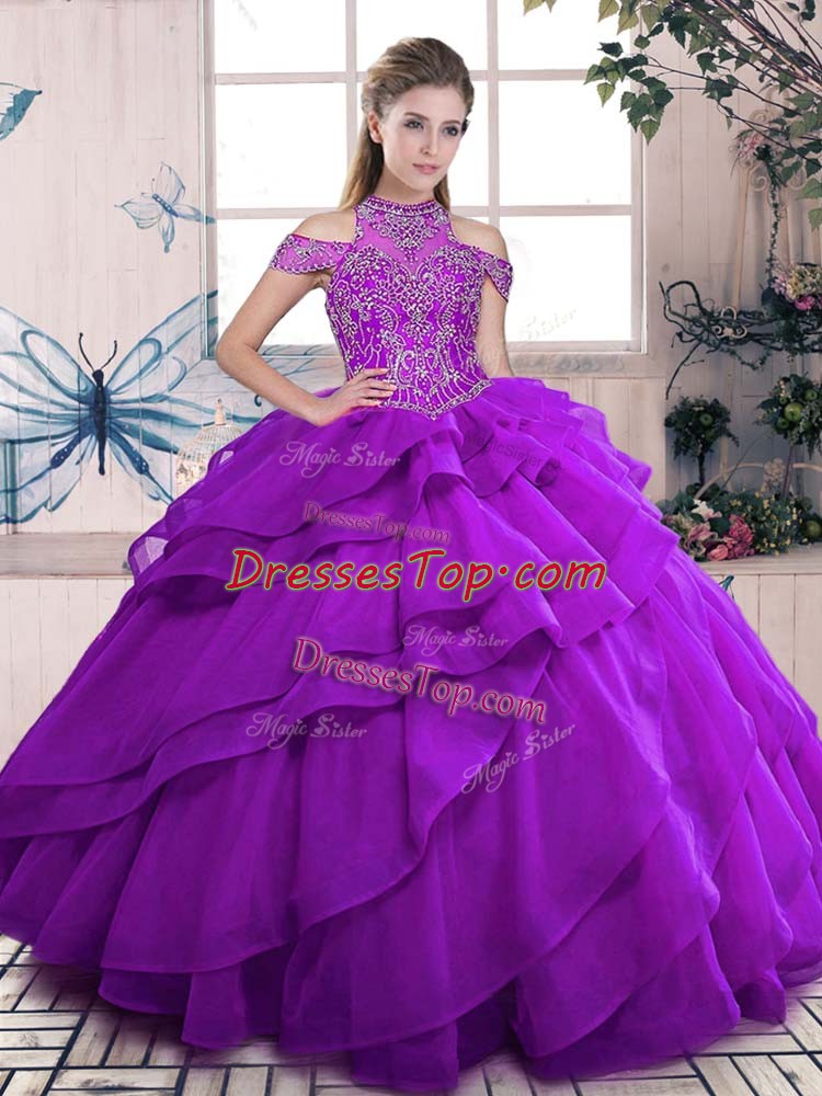 Beautiful Purple Ball Gowns Organza High-neck Sleeveless Beading and Ruffles Floor Length Lace Up Quinceanera Dress