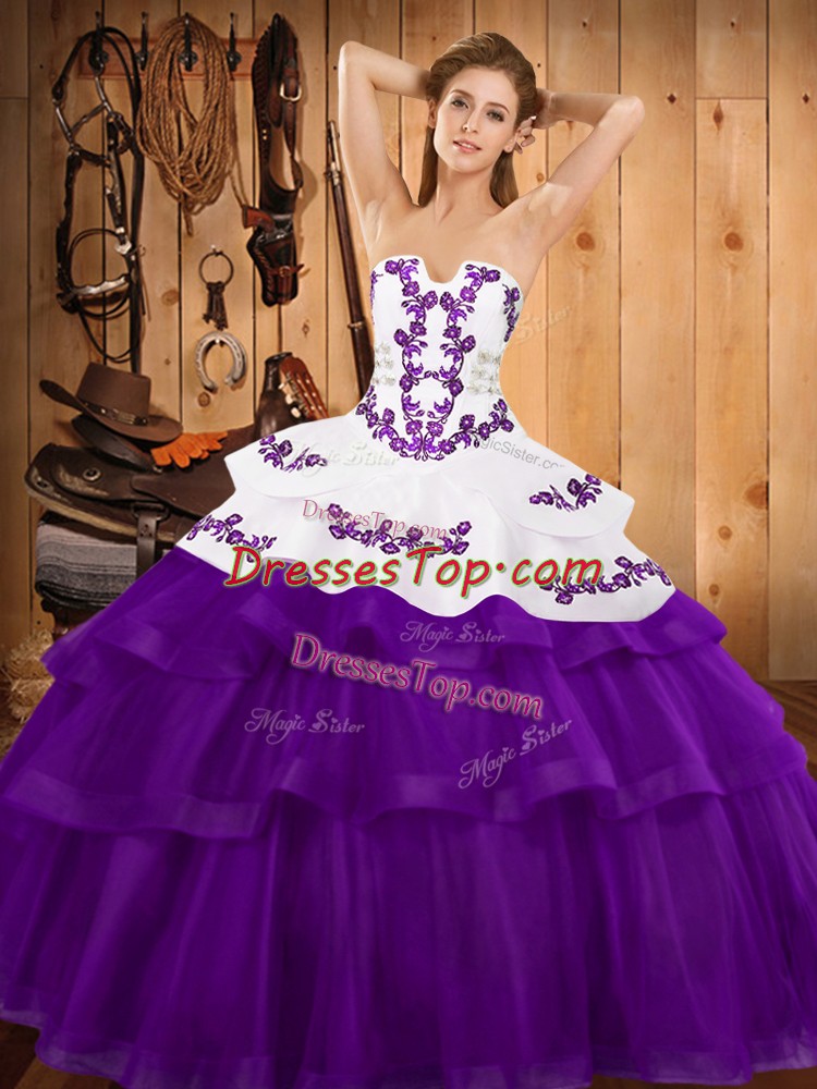 Beautiful Purple Lace Up Strapless Embroidery and Ruffled Layers Vestidos de Quinceanera Tulle Sleeveless Sweep Train