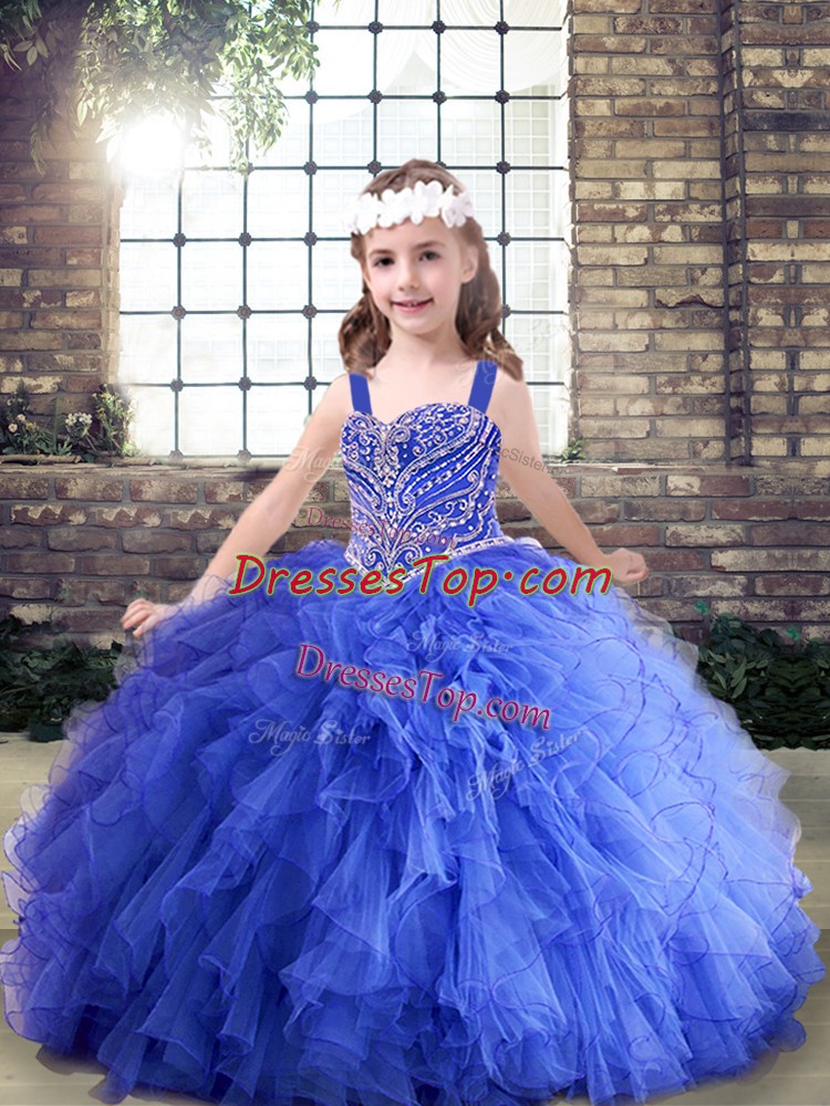 Beautiful Straps Sleeveless Child Pageant Dress Floor Length Beading and Ruffles Blue Tulle