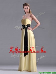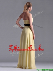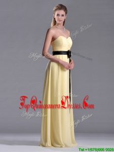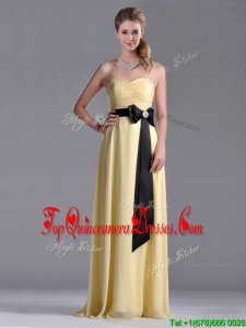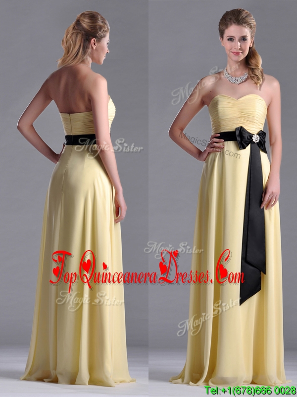 Beautiful Sweetheart Yellow Dama Dress with Ruching and Black Bowknot
