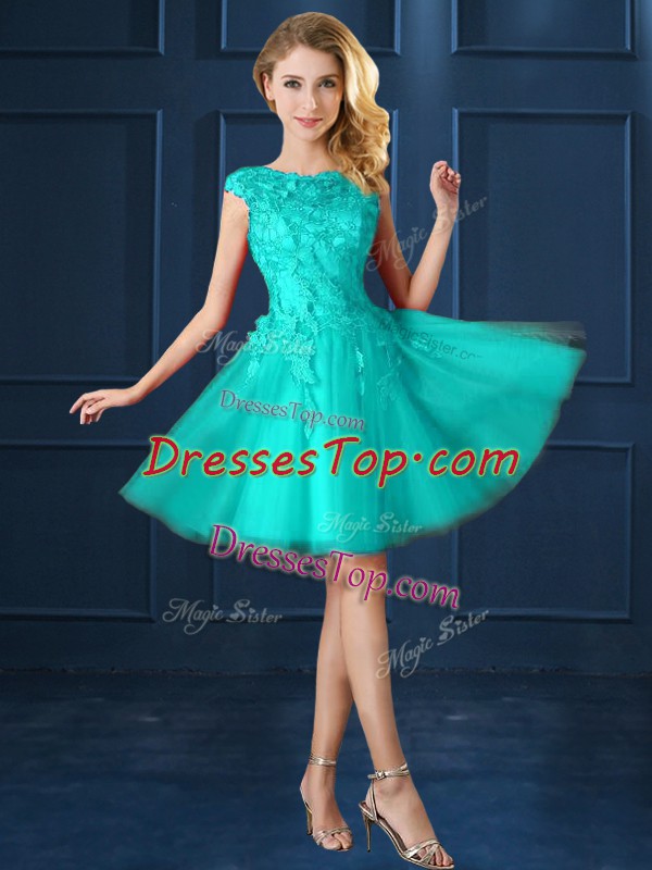 Beautiful Tulle Bateau Cap Sleeves Lace Up Lace and Belt Quinceanera Court of Honor Dress in Turquoise