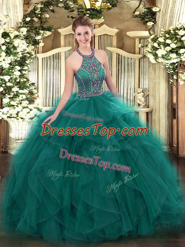 Beautiful Tulle Halter Top Sleeveless Lace Up Beading and Ruffles 15 Quinceanera Dress in Teal