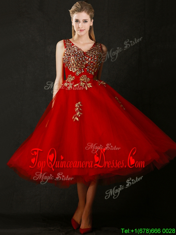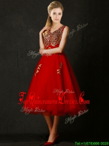 Beautiful V Neck Tea Length Damas Dress with Beading and Appliques