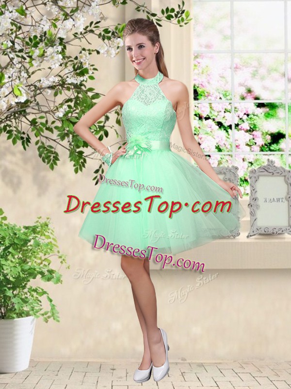 Best Apple Green Sleeveless Lace and Belt Knee Length Dama Dress for Quinceanera