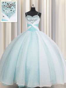 Best Aqua Blue Lace Up Spaghetti Straps Beading and Ruching 15th Birthday Dress Organza Sleeveless