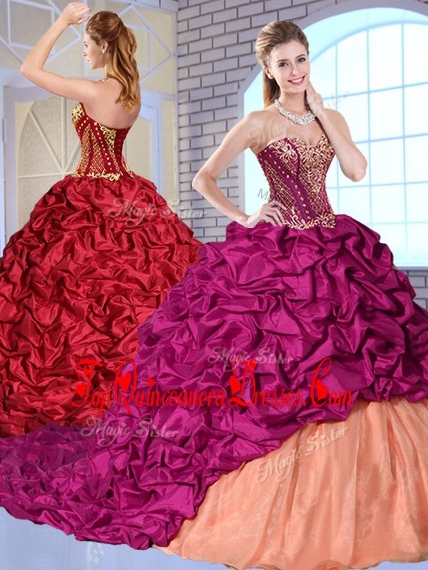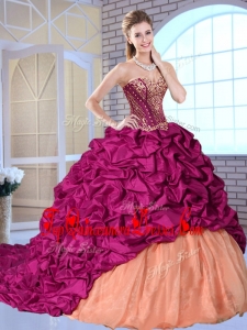 Best Brush Train Ruffles and Appliques Quinceanera Gowns in Wine Red