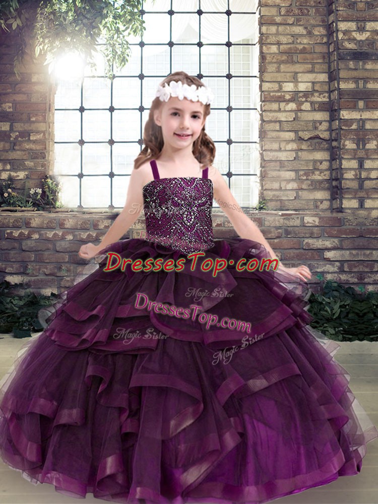 Best Eggplant Purple Lace Up Pageant Gowns For Girls Beading and Ruffles Sleeveless Floor Length