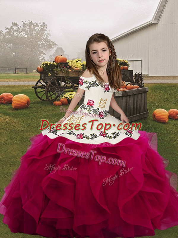 Best Floor Length Lace Up Little Girls Pageant Gowns Fuchsia for Party and Military Ball and Wedding Party with Embroidery and Ruffles