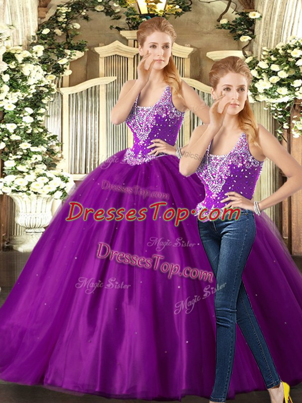 Best Floor Length Lace Up Quinceanera Dresses Purple for Military Ball and Sweet 16 and Quinceanera with Beading