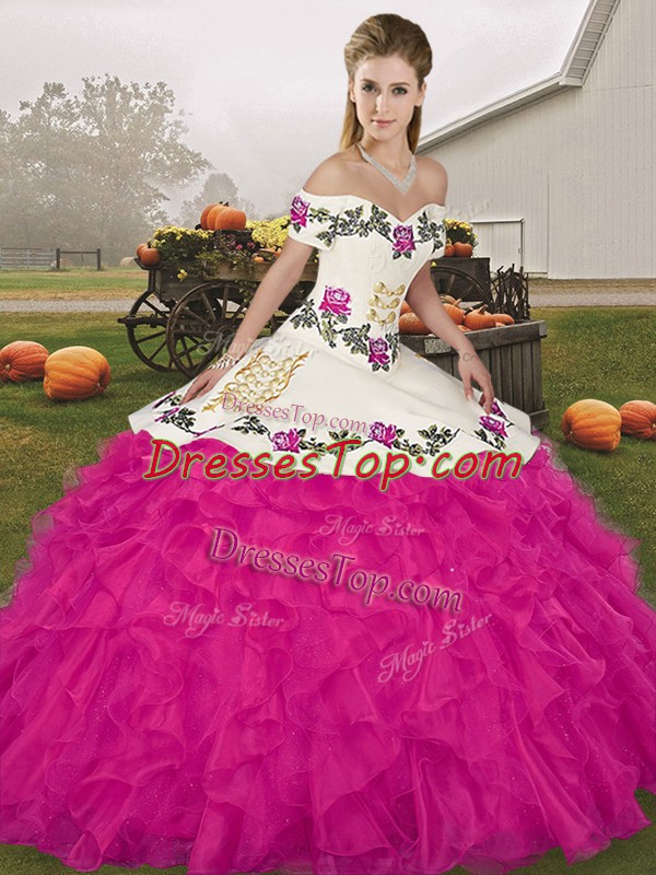 Best Fuchsia Sleeveless Embroidery and Ruffles Floor Length Sweet 16 Dress