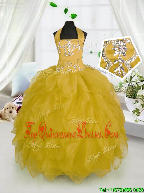 Best Gold Ball Gowns Halter Top Sleeveless Organza Floor Length Lace Up Beading and Ruffles Pageant Dress